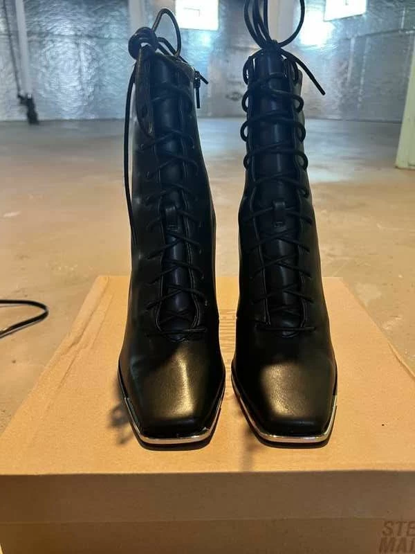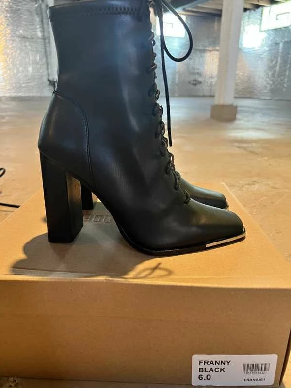 Lace yourself into FRANNY and start the day in style! This bootie’s sky-high stacked heel offers a major boost, while an angular metal-trimmed toe polishes the look.