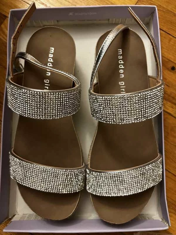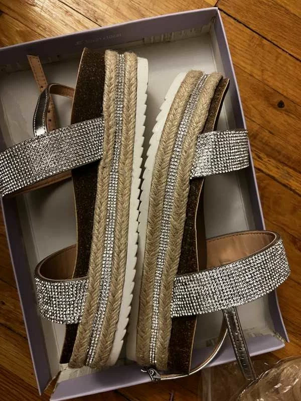 This Madden Girl Glitzie platform is designed with a textile upper and sparkling details infused in its espadrille platform for a glitzy and glam finish.