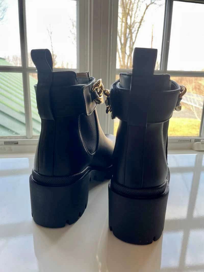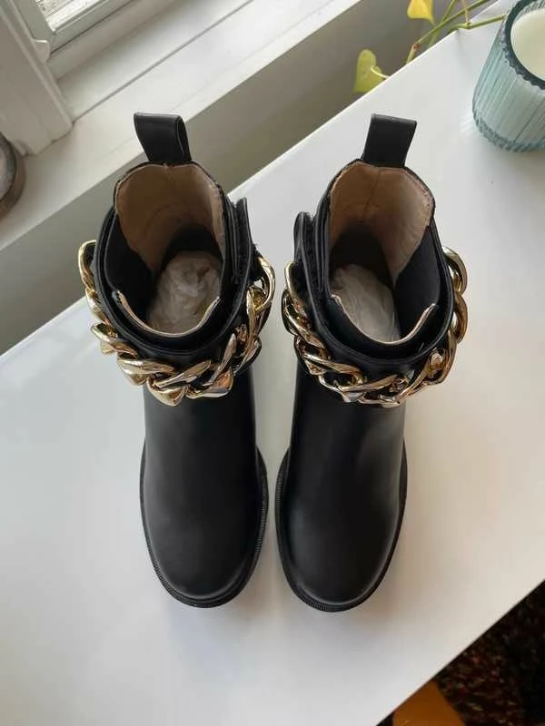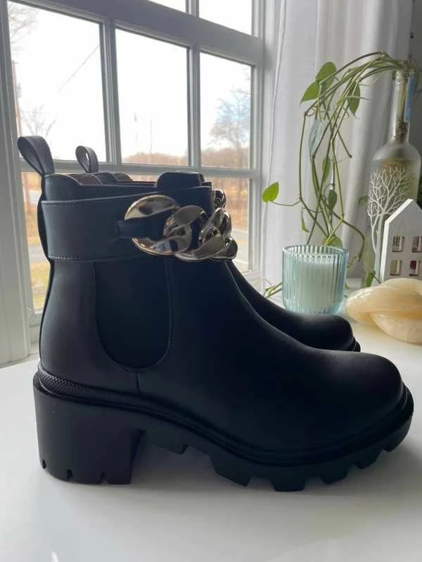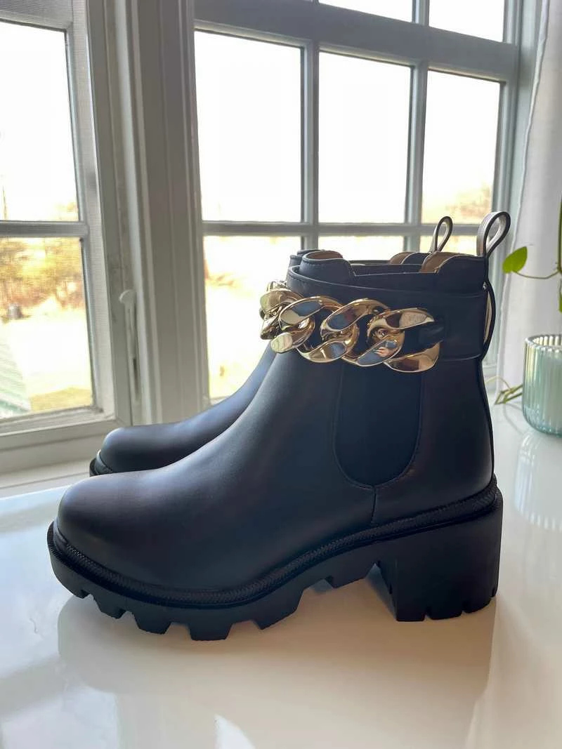 An ultra-functional ankle boot with a touch of fancy flair! AMULET-C dresses up a sturdy lug-soled Chelsea silhouette with a chunky gold tone chain accent.