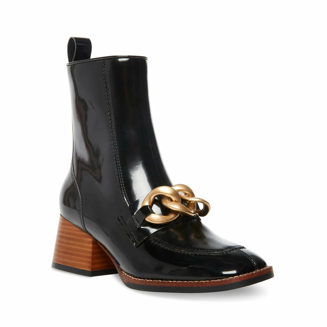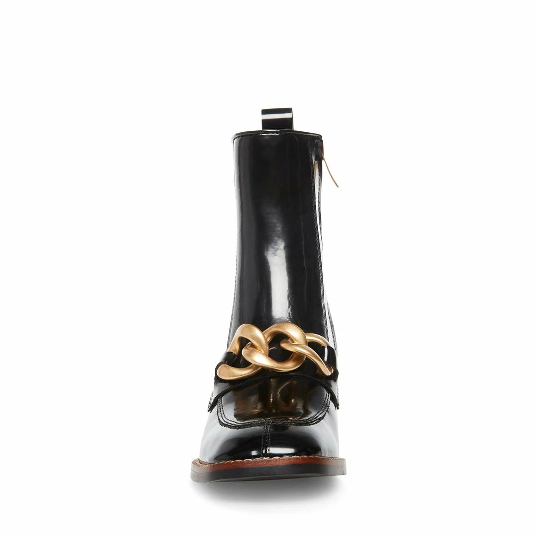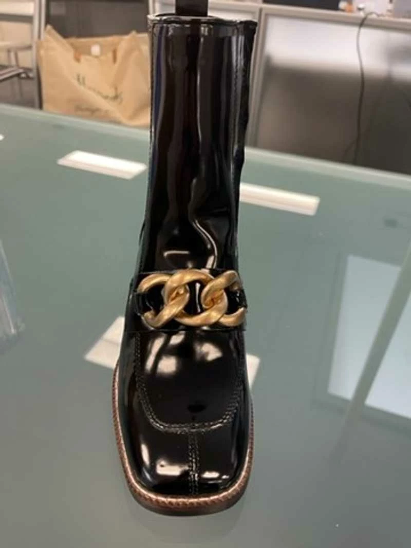 Give basic ankle boots a break with LOREEN. This bootie features a mod block heel and bold chain hardware. Wear them with an all-black outfit for a bit of drama.