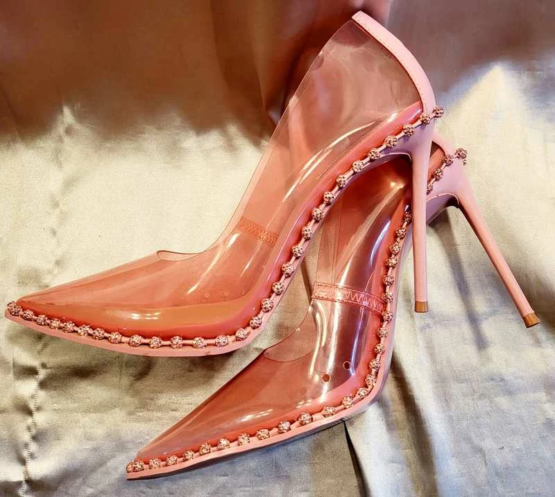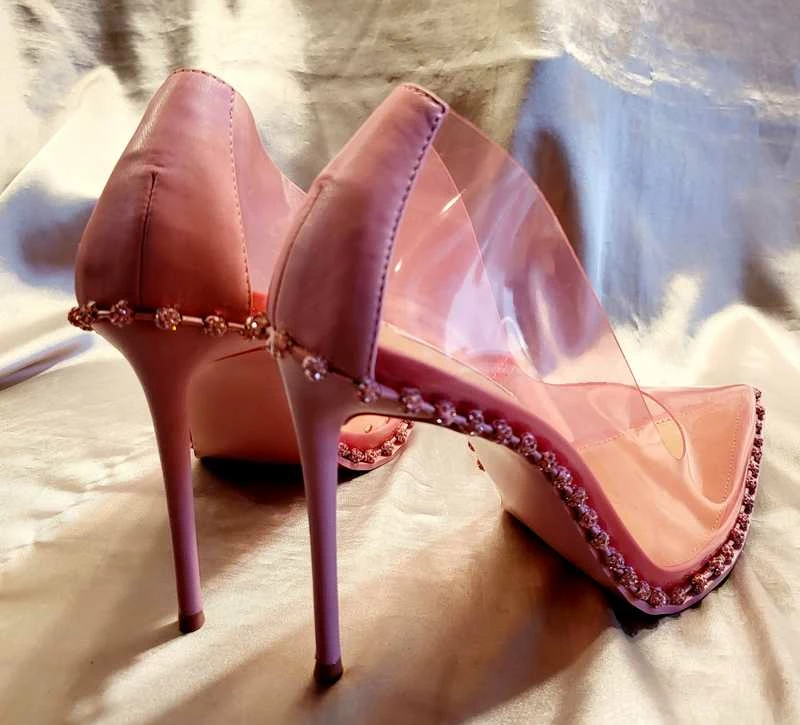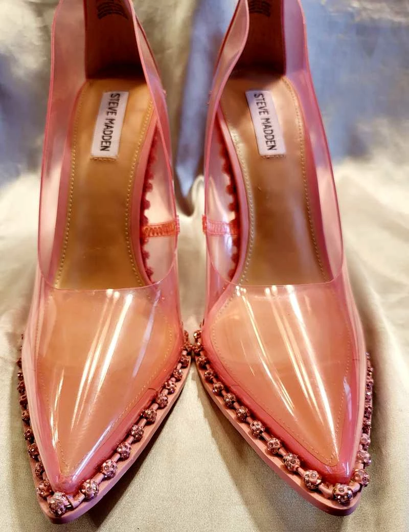 A trendy transparent upper gives this pump modern direction, while foot-framing rhinestones bring the glam factor. Step in and sparkle as you strut!