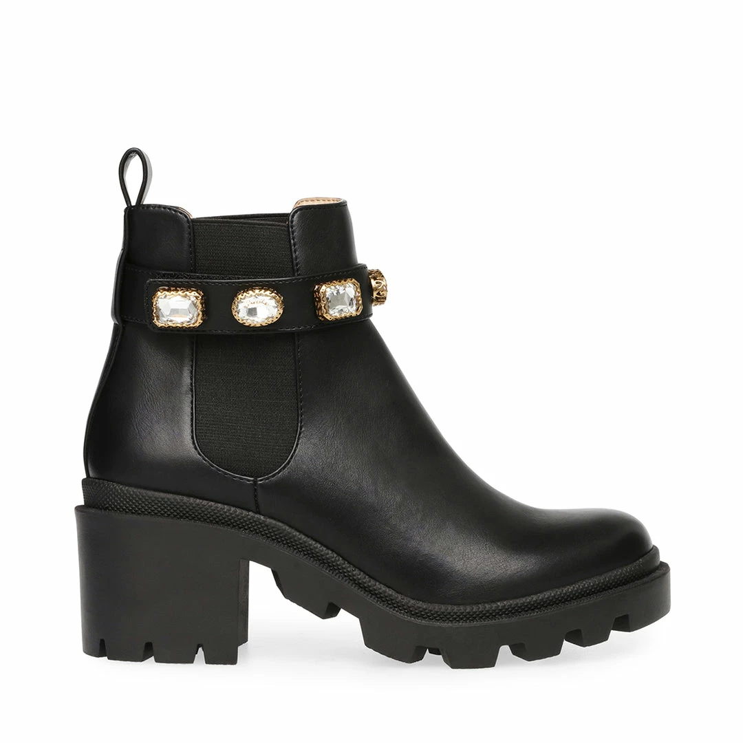 Jewelry-meets-footwear! A rhinestone-adorned strap elevates AMULET’s stretchy pull-on shaft, while a chunky heel and treaded sole provide support and stability.
