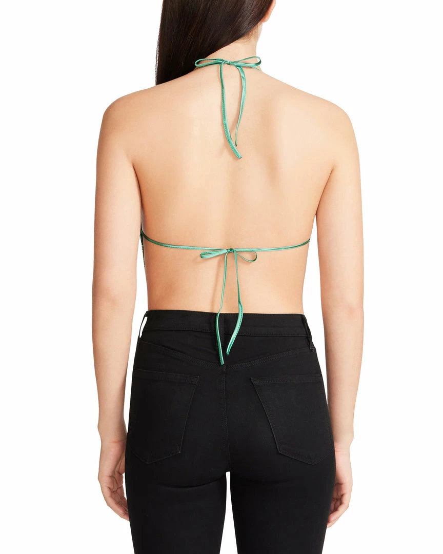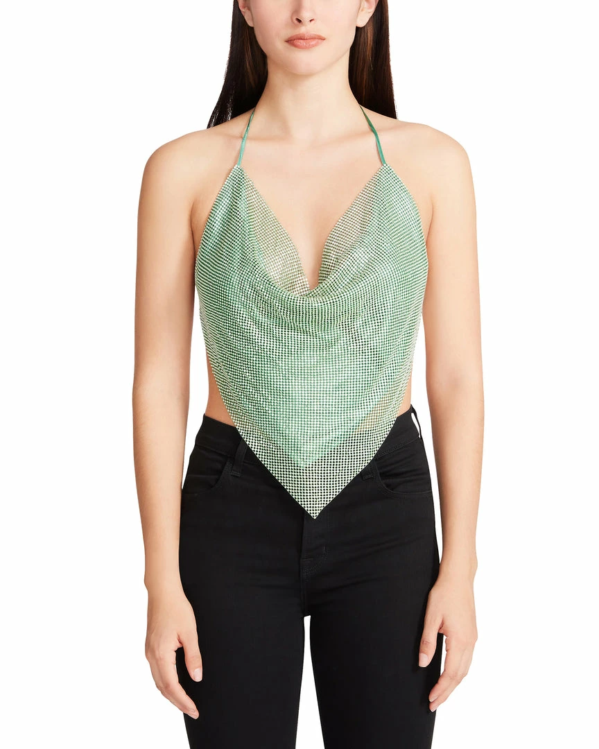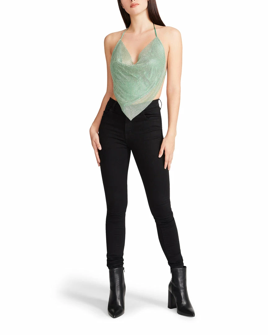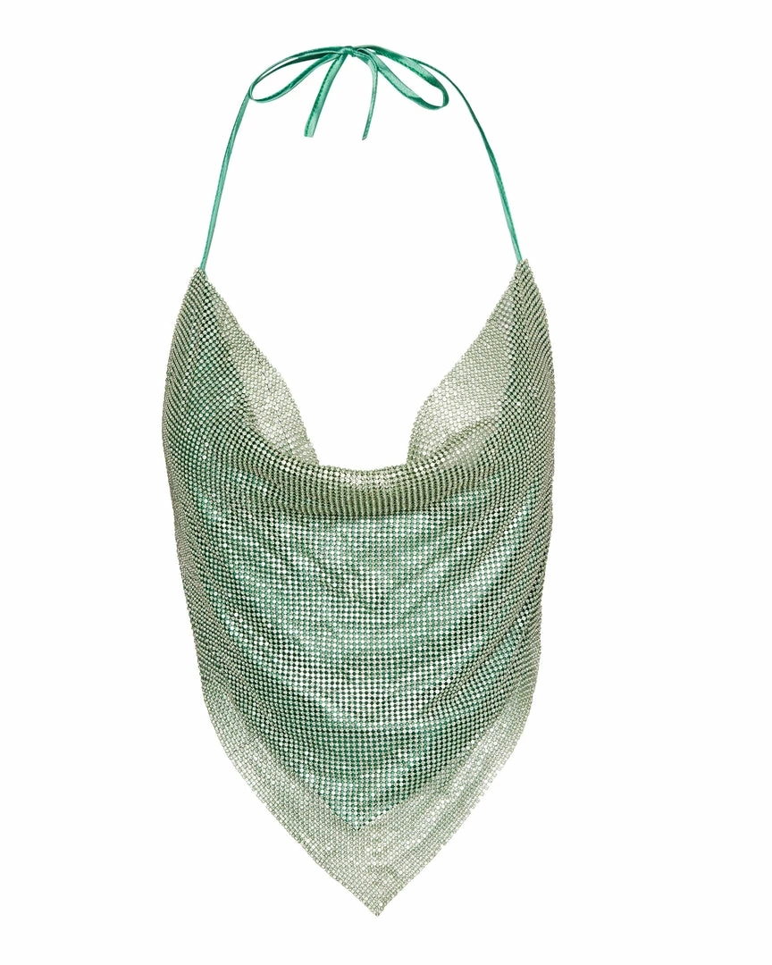 The 2000s called. They want to loan you the hottest statement piece of the decade. The Barely There Rhinestone Top serves nostalgia with its always classic triangle shape, cowl neck, and rhinestone-studded fabric.