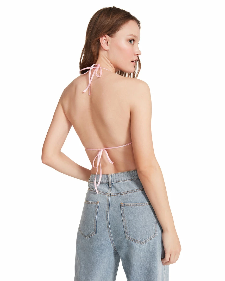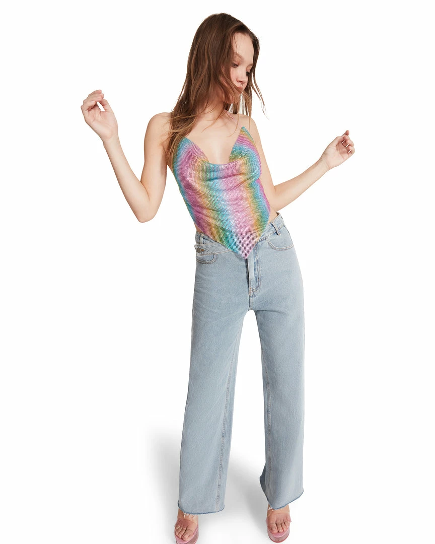 The 2000s called. They want to loan you the hottest statement piece of the decade. The Barely There Rhinestone Top serves nostalgia with its always classic triangle shape, cowl neck, and rhinestone-studded fabric.