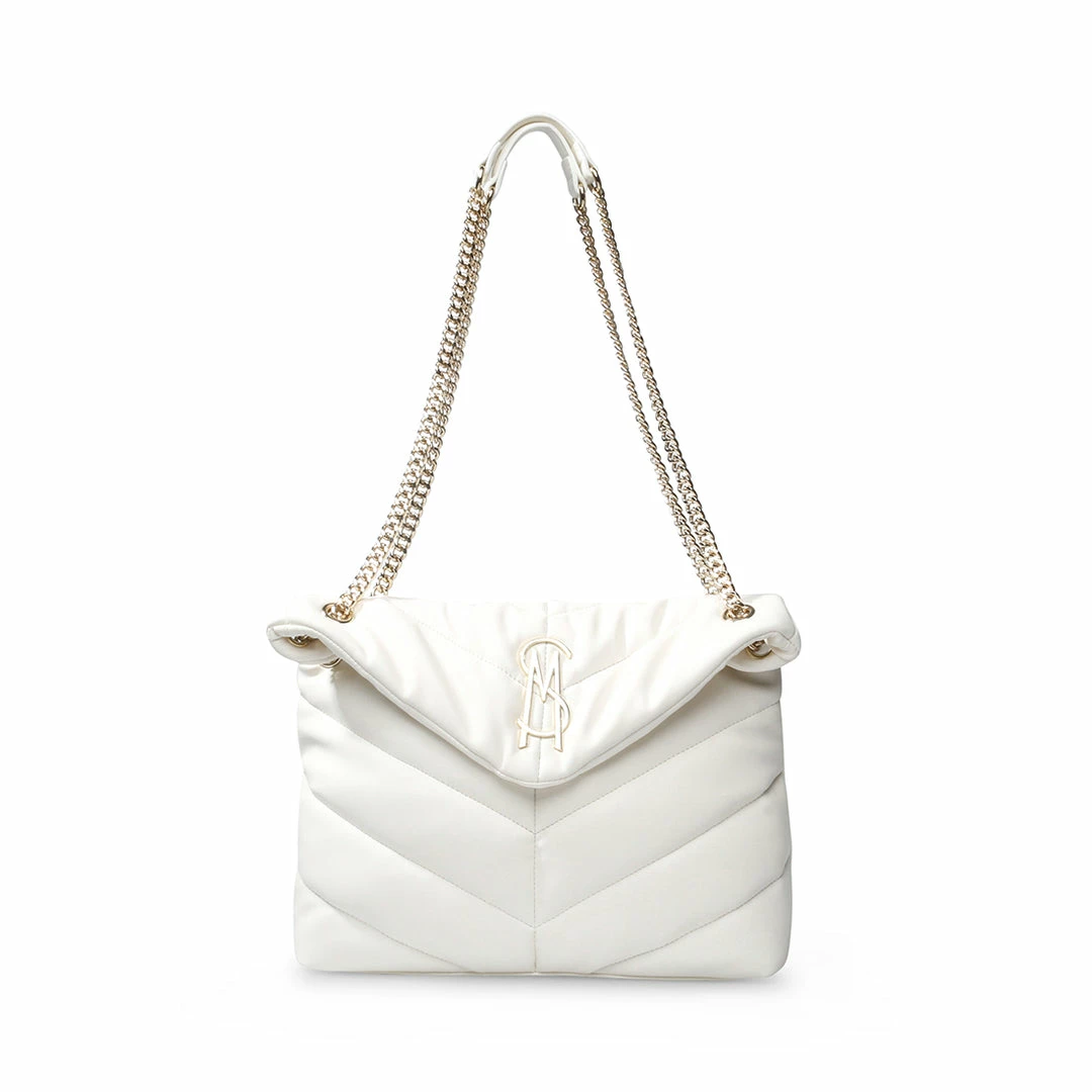 The BBRITTA bag features exaggerated, puffy chevron quilting and chain handles long enough to be worn over the shoulder.