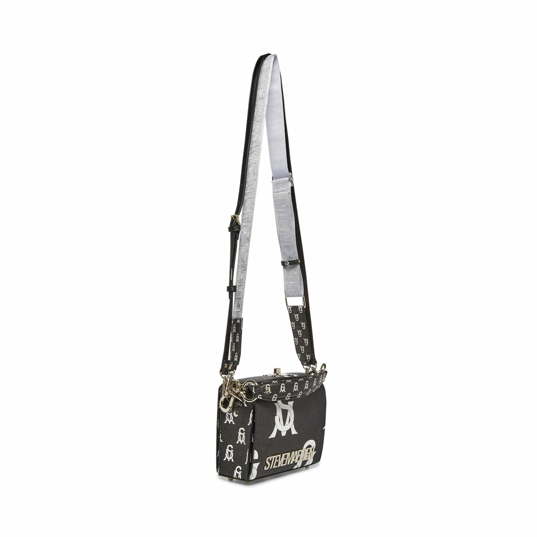 The BKINDER is a structured box purse featuring contrasting logo prints wrapped around the front and back and on the sides as well as on the interchangeable straps.
