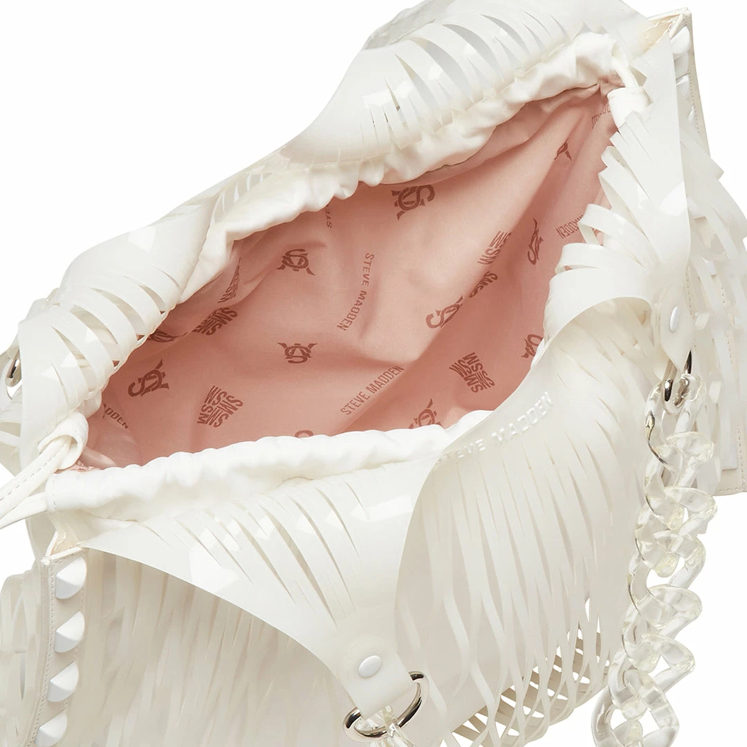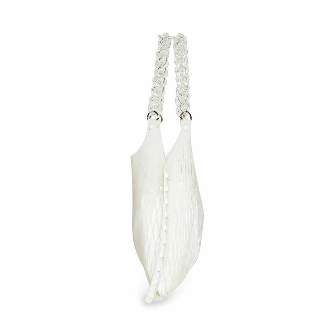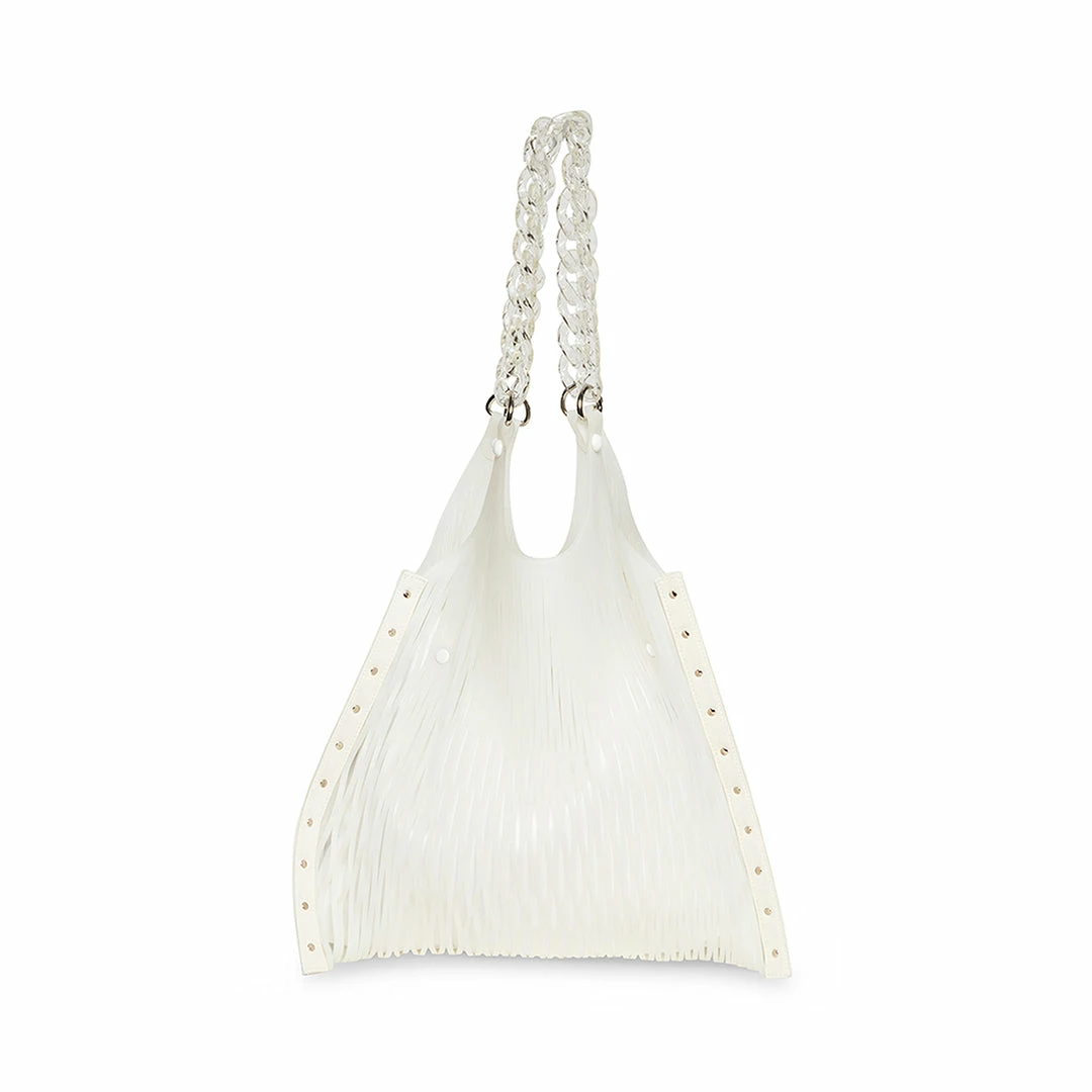The BLASERS bag layers texture on texture. The expandable translucent mesh exterior is finished with matching stud trim on the sides for structure and topped with matching translucent chain handle.