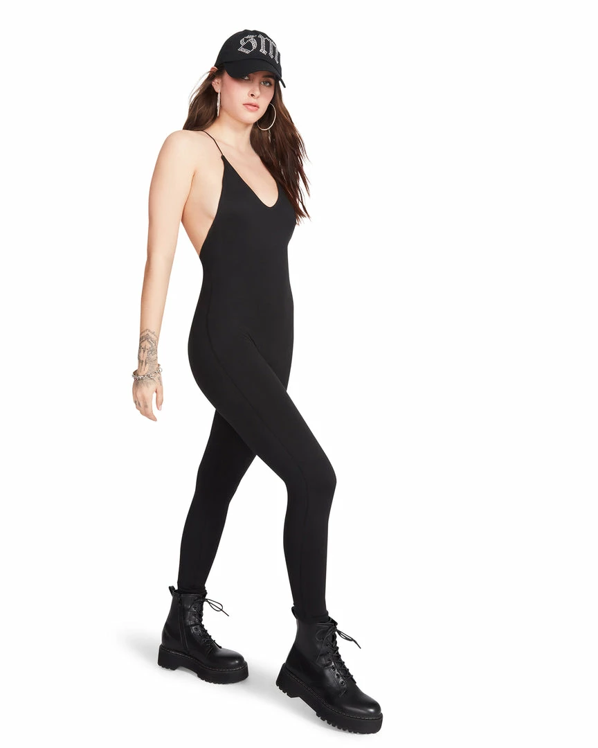 The Black Ribbed Catsuit is a soft, form fitting one piece with a plunging neckline. Meow.