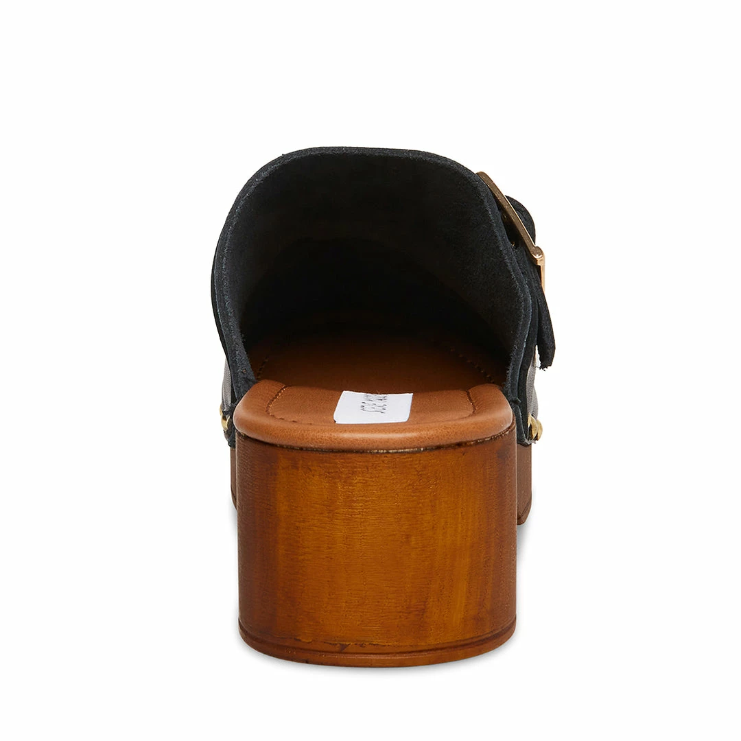 A retro 70s-inspired clog is brought back to life with DANA. Set on a woodgrain sole, this pair features bold gold studs and buckle details.