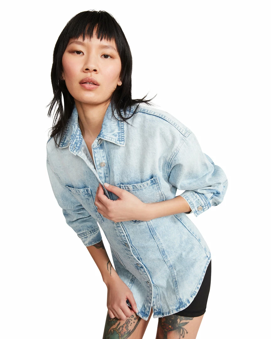 Everyone needs a denim shirt in their closet. The Elastic Back Denim Shirt takes a classic stape and modernizes it with a flattering elastic back detail.