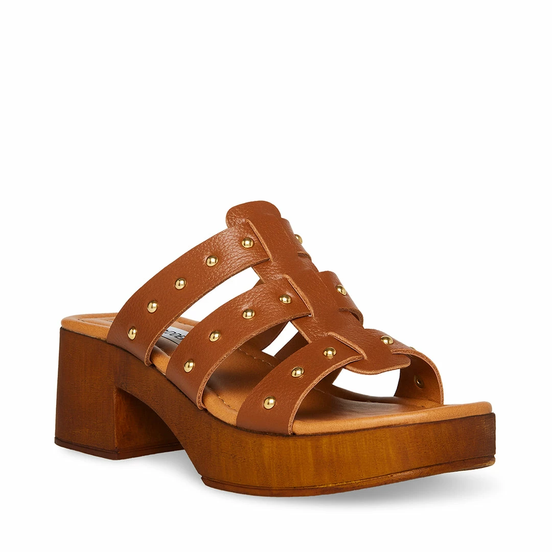 Studded leather straps and a faux wood platform heel make the FIONA slide sandal an easy casual wardrobe staple.