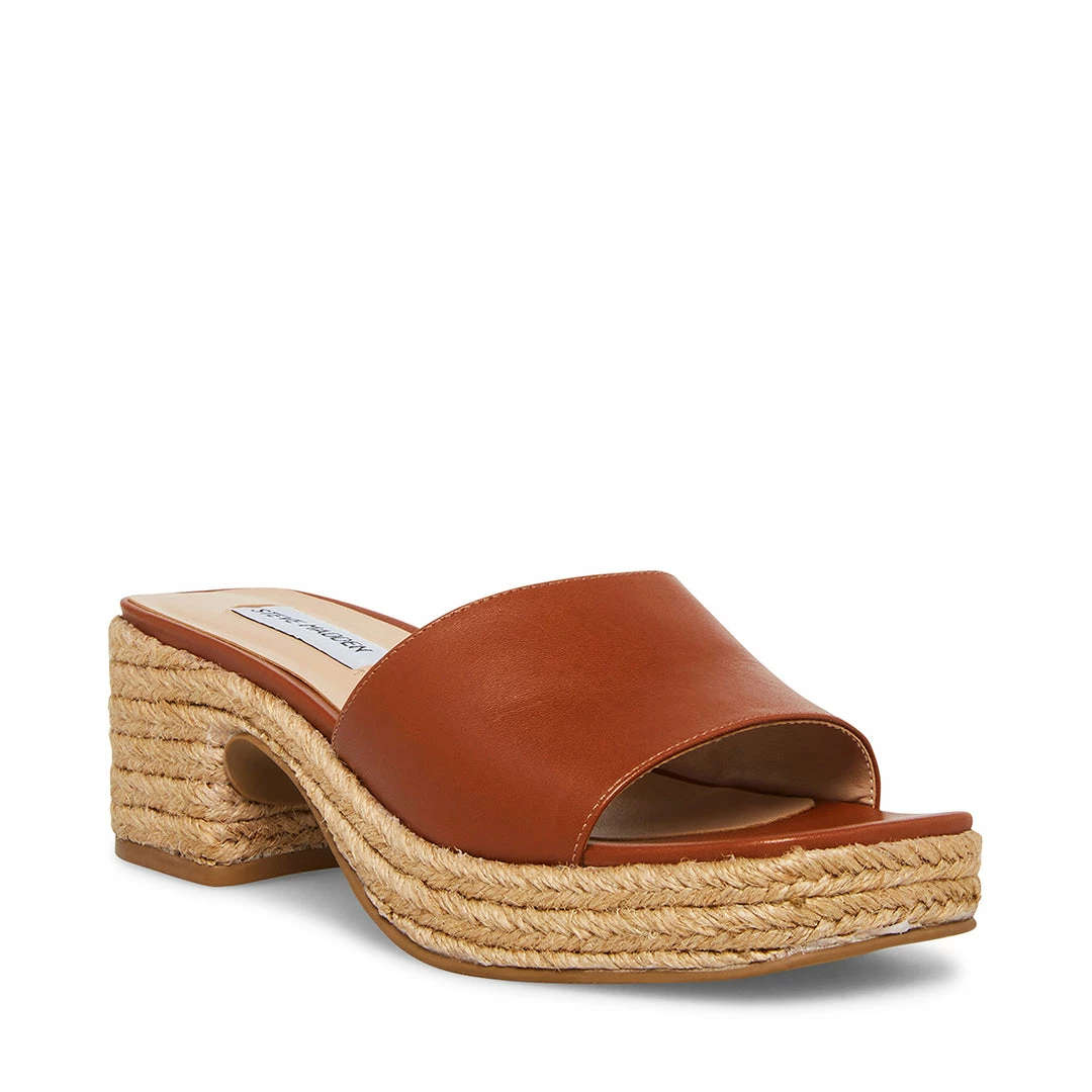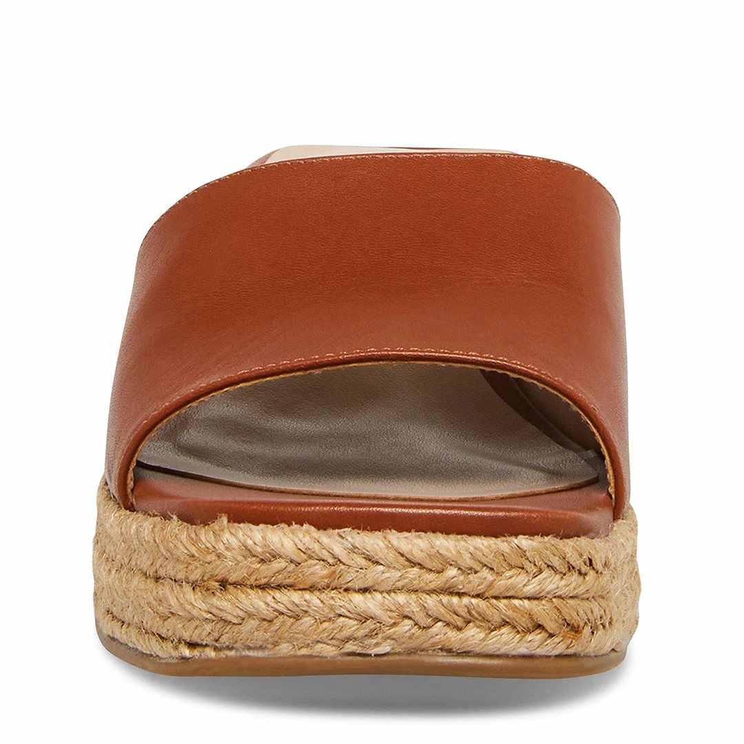 The platform heel on the MADISON slide sandal is wrapped in raffia texture braid to contrast with the smooth leather front strap.