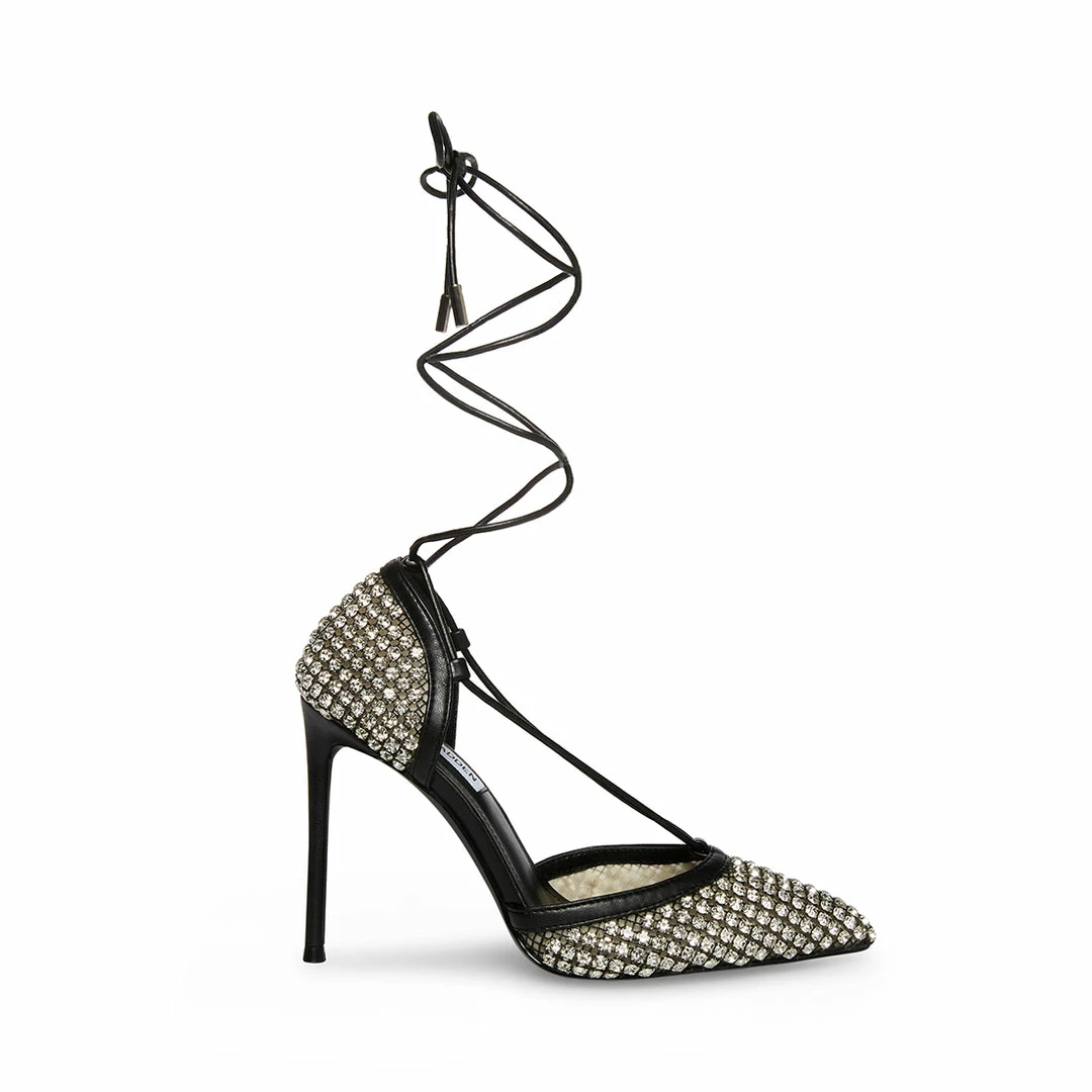 Stun as you strut in VANITY. These rhinestone-covered beauties are all about the bling, featuring a sharp stiletto heel and sexy straps that wrap up your leg.