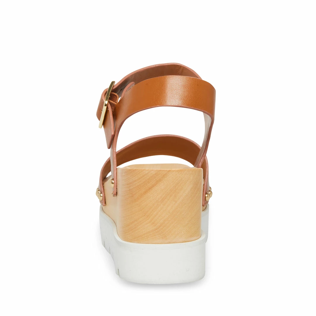 Rivet studs accent where the RUSH sandal’s straps are attached to a faux wood finish wedge, which is stacked on a white lug sole platform.