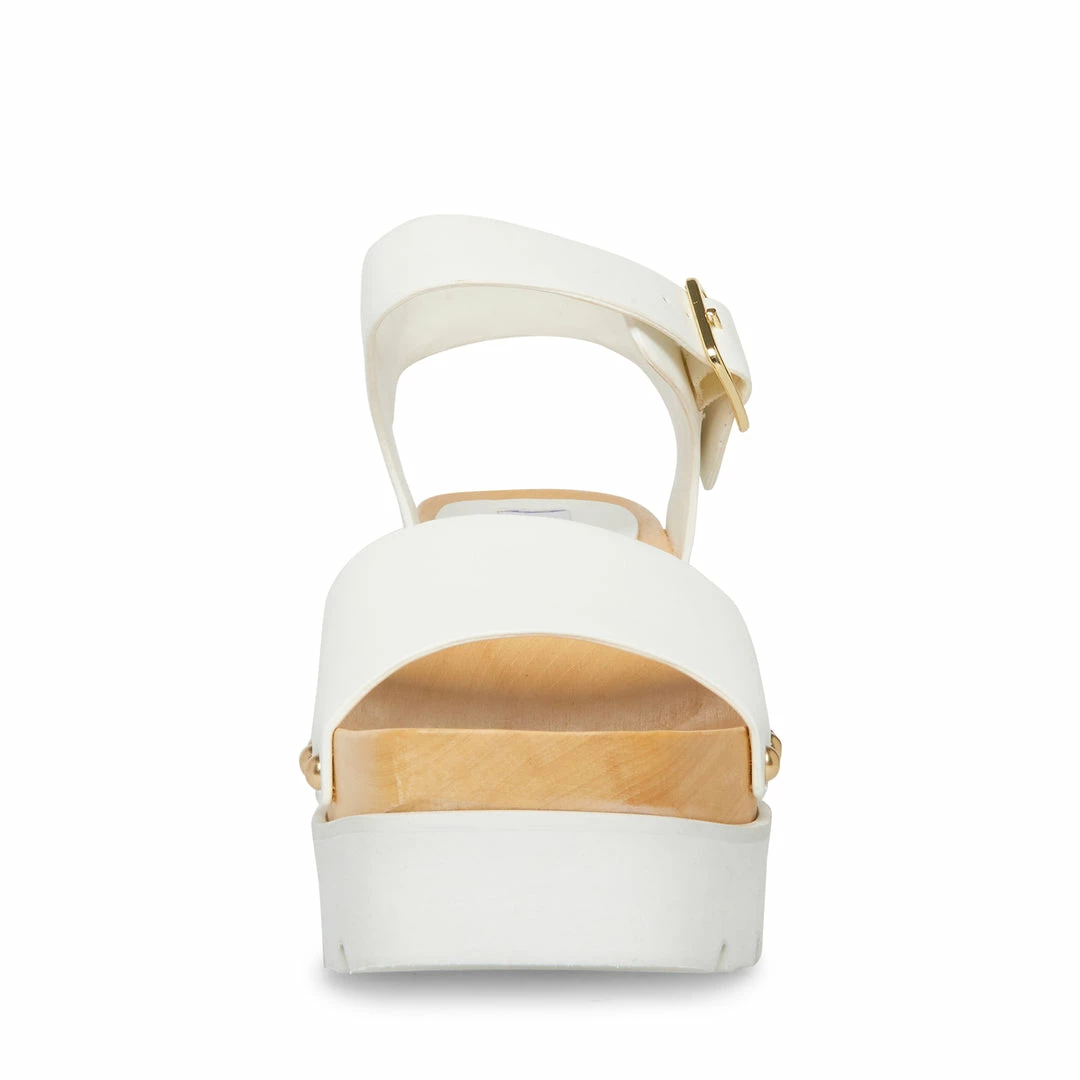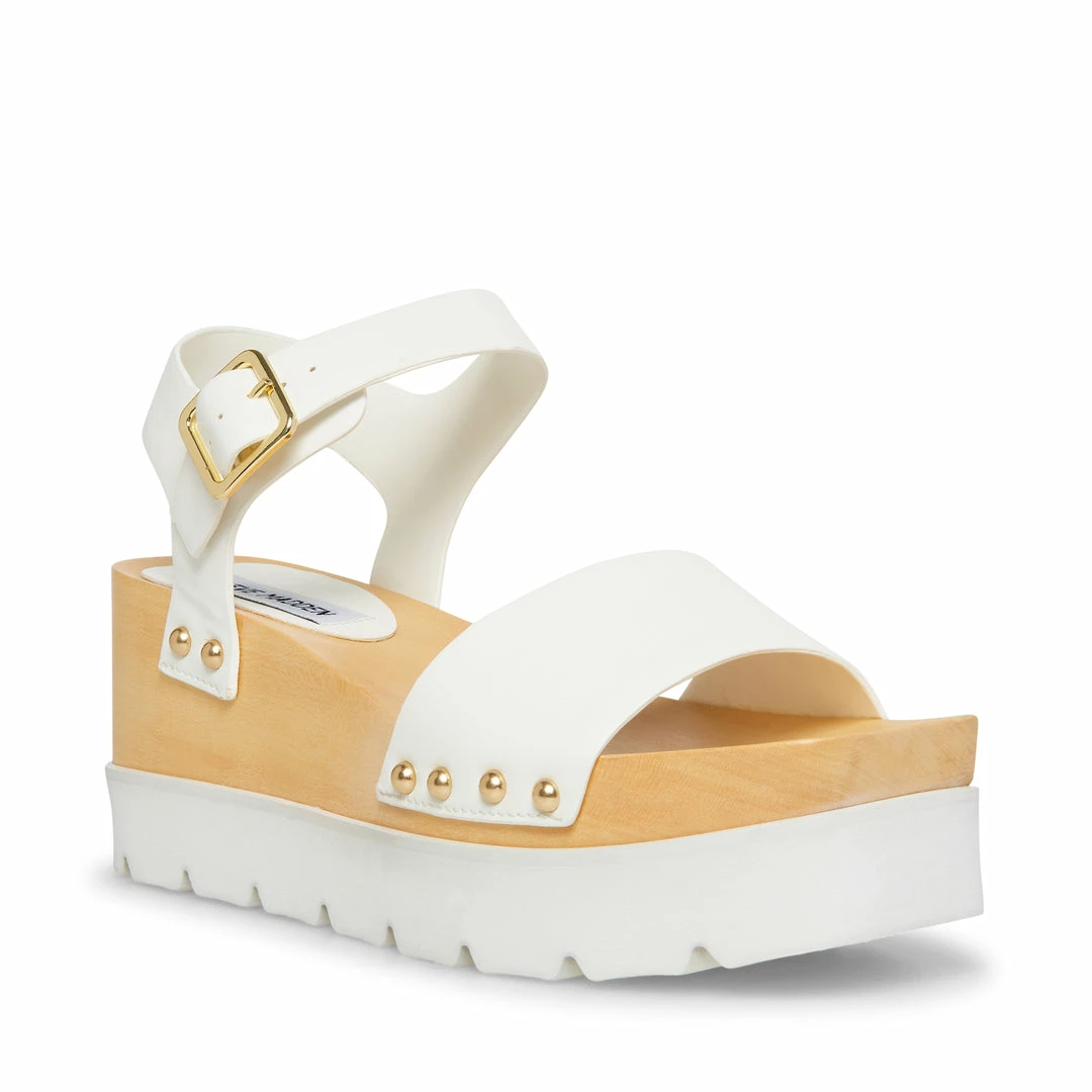 Rivet studs accent where the RUSH sandal’s straps are attached to a faux wood finish wedge, which is stacked on a white lug sole platform.
