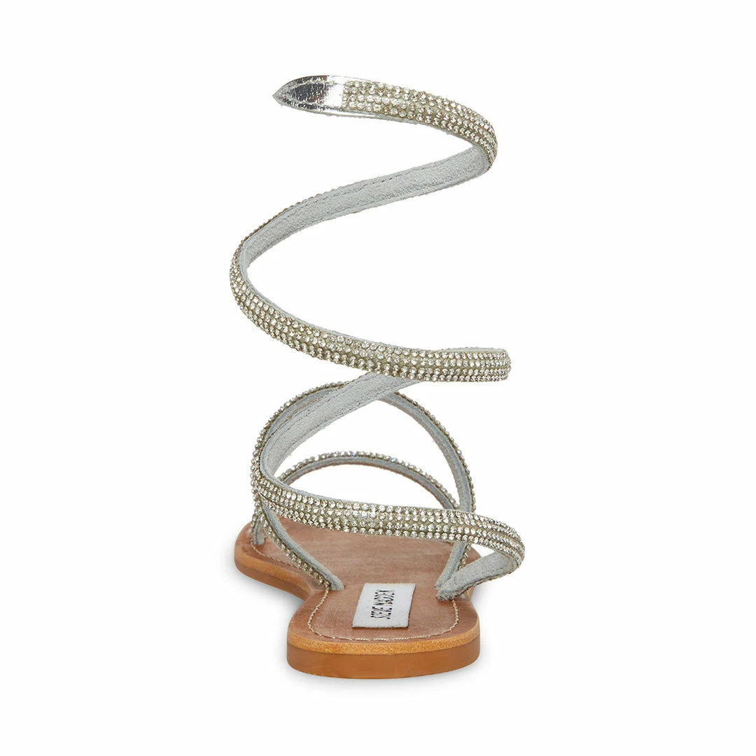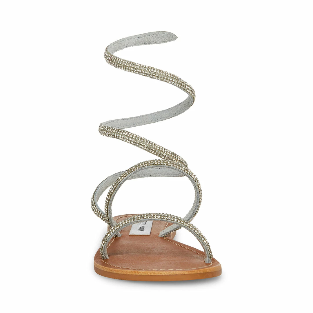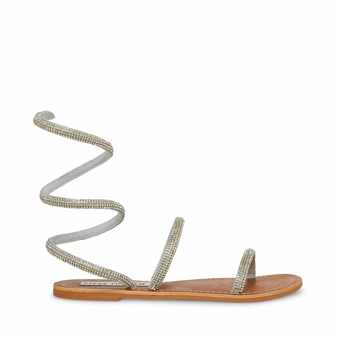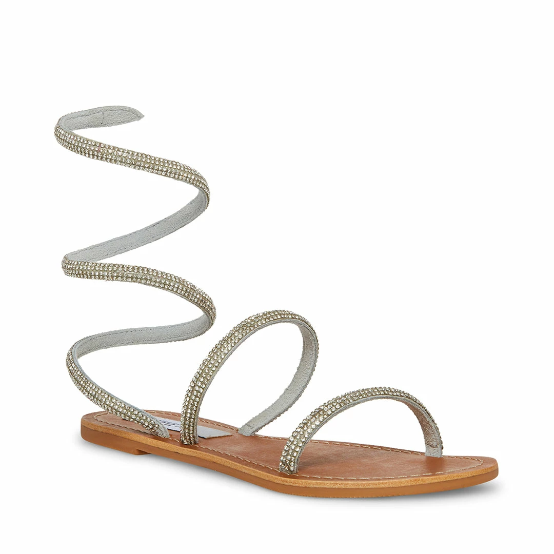 The SHIRA flat sandal features two front straps and a coil-wrapped ankle strap encrusted in rhinestones.