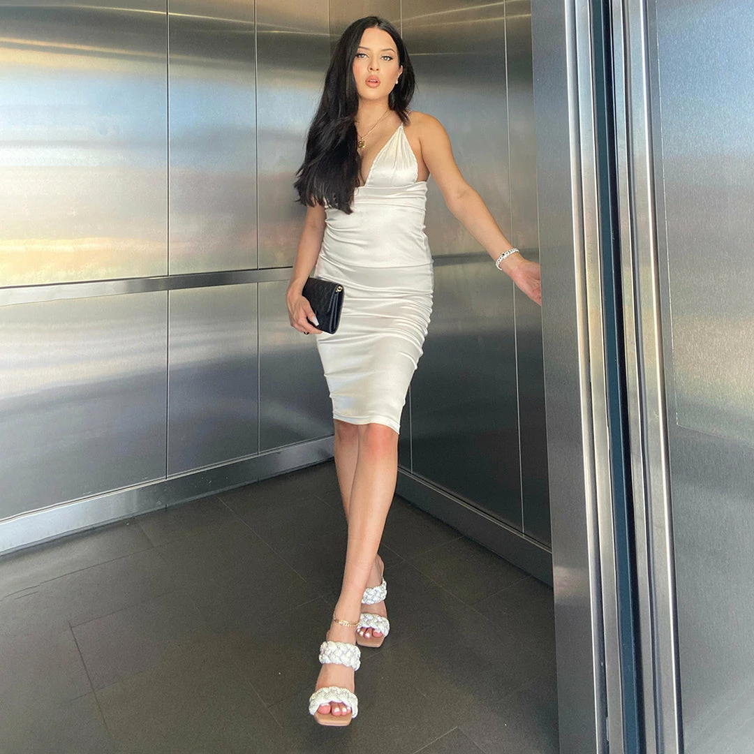Elevate your go-to open-toe pump with KENLEY-R heels. Thick braided straps with rhinestone embellishments complement a tall slender heel, for an ultra-luxe appeal.