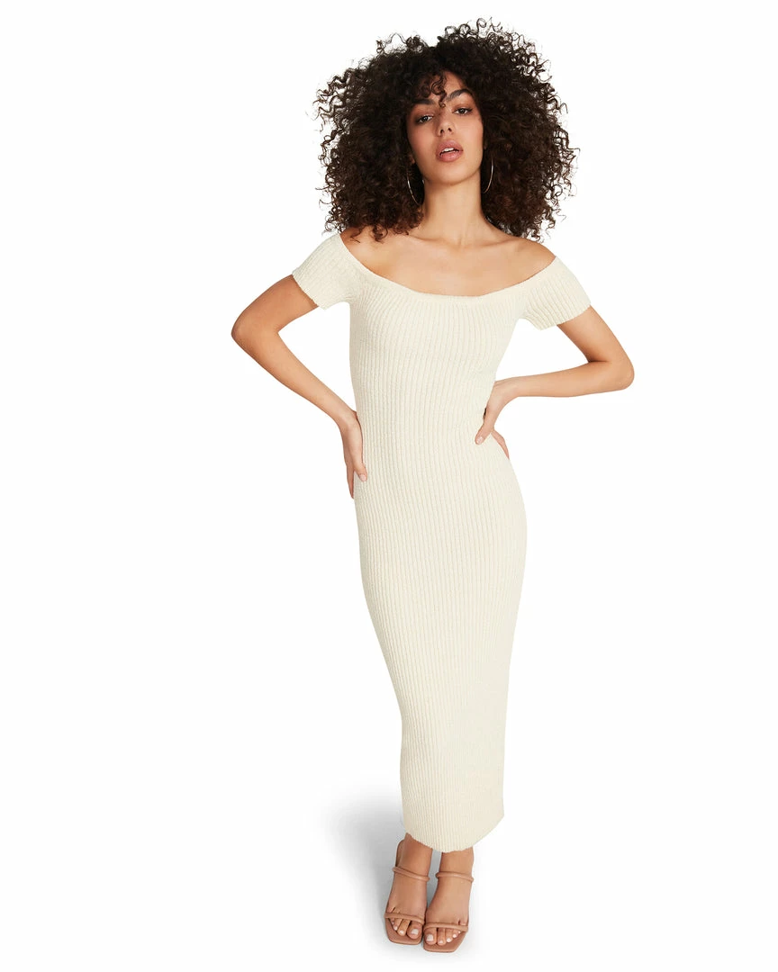 We love her. The Ribbed Maxi is a soft bodycon maxi dress featuring off-the-shoulder sleeves.