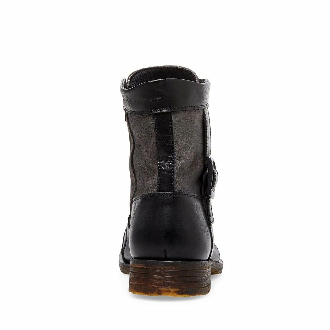 With dual zipper closures and a buckled strap detail, this leather lace-up makes a utilitarian statement. Tonal piecing highlights construction details without straying from a monochromatic color palette.