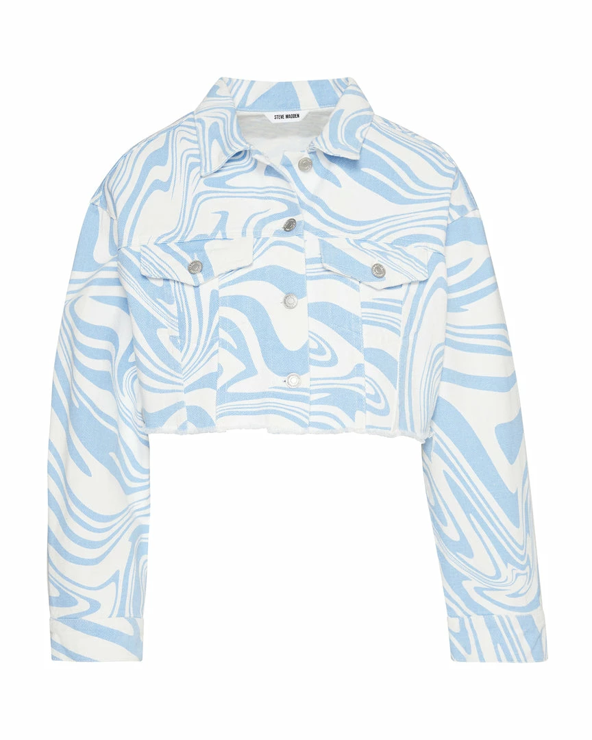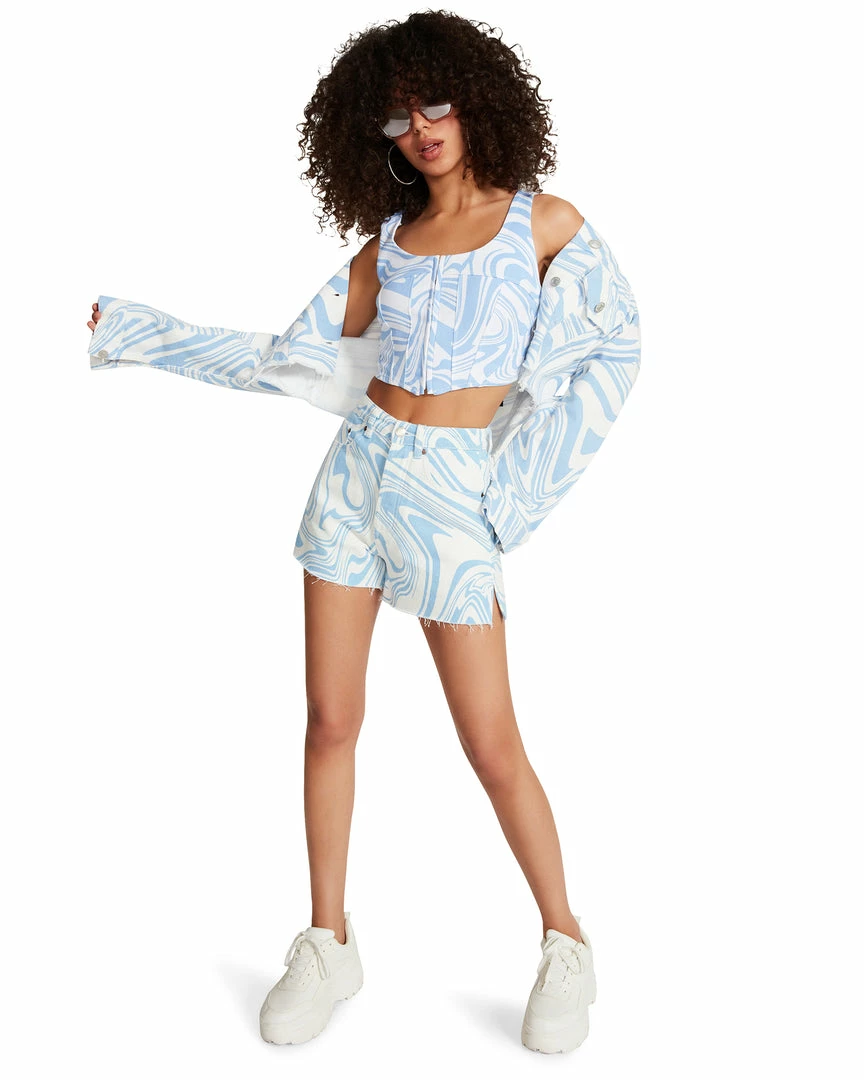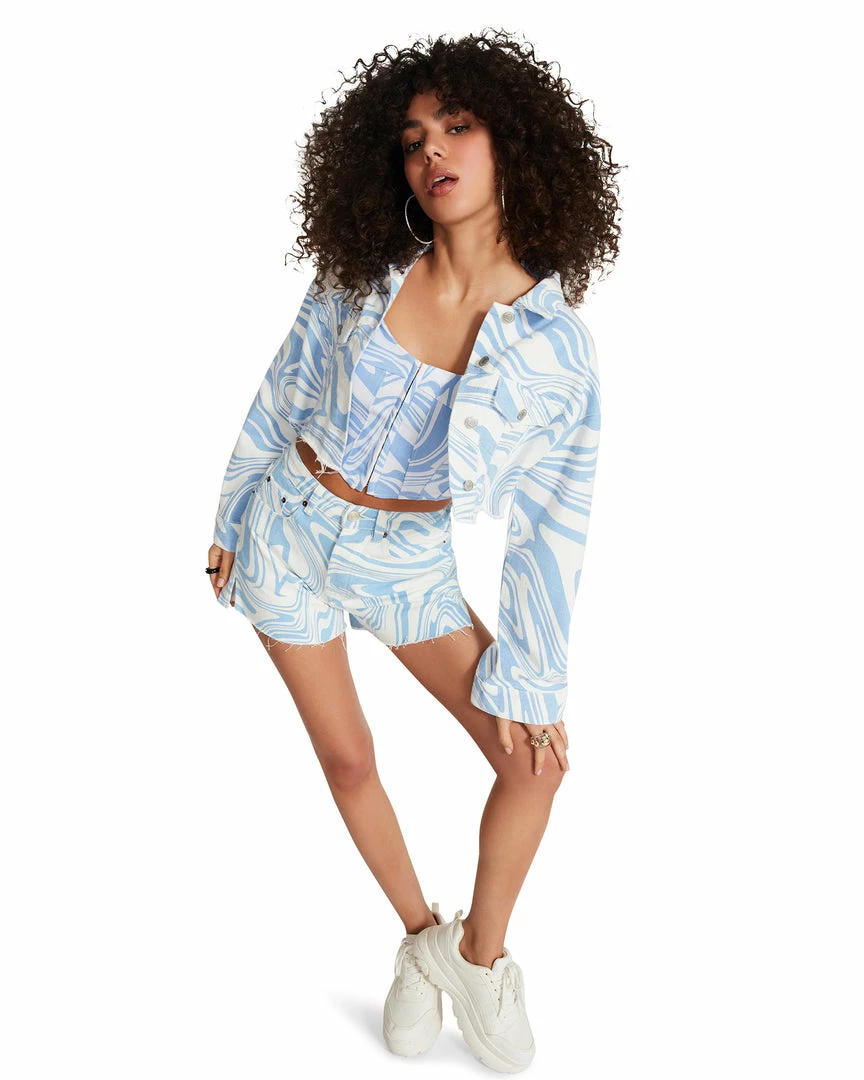 The Swirl Denim Jacket features a bold swirl pattern, cropped hemline, and full sleeves. She’s a dream with the Swirl Denim Corset and Swirl Denim Shorts.