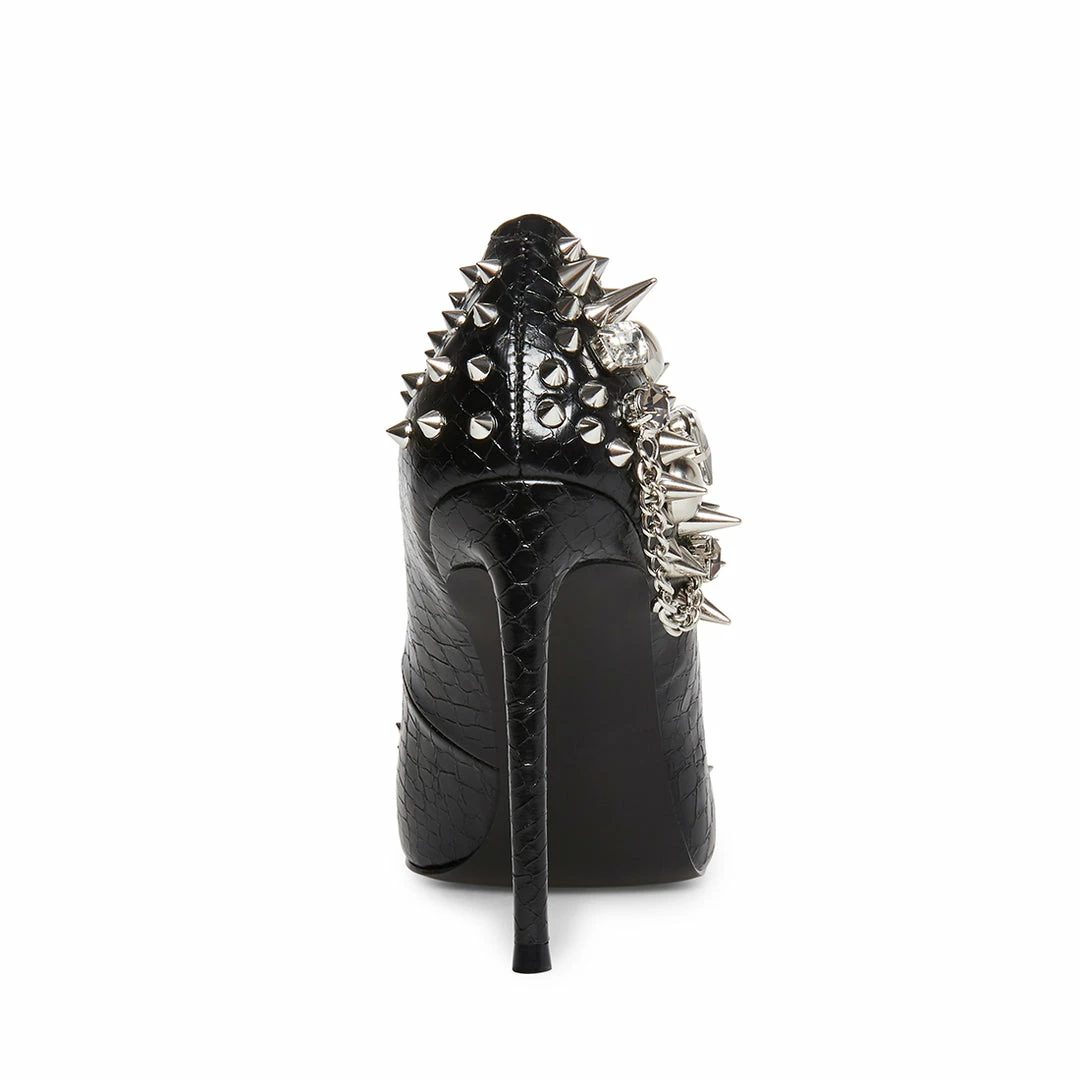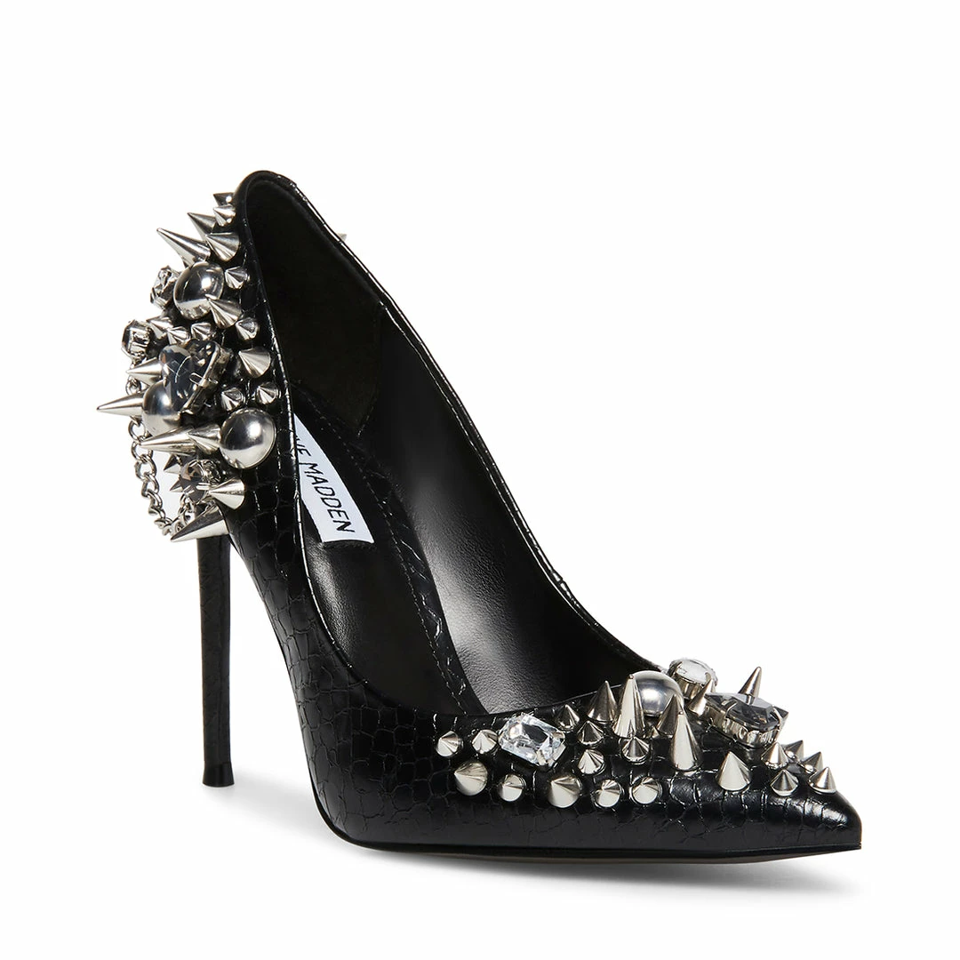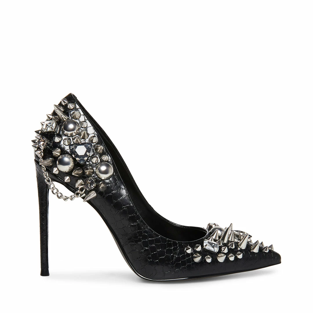 Fit for a punk princess, VERONICKA balances glamour with edgy attitude. Mixed metal embellishment and sparkling rhinestones adorn this pump silhouette, characterized by a pointed toe and sharp stiletto heel.