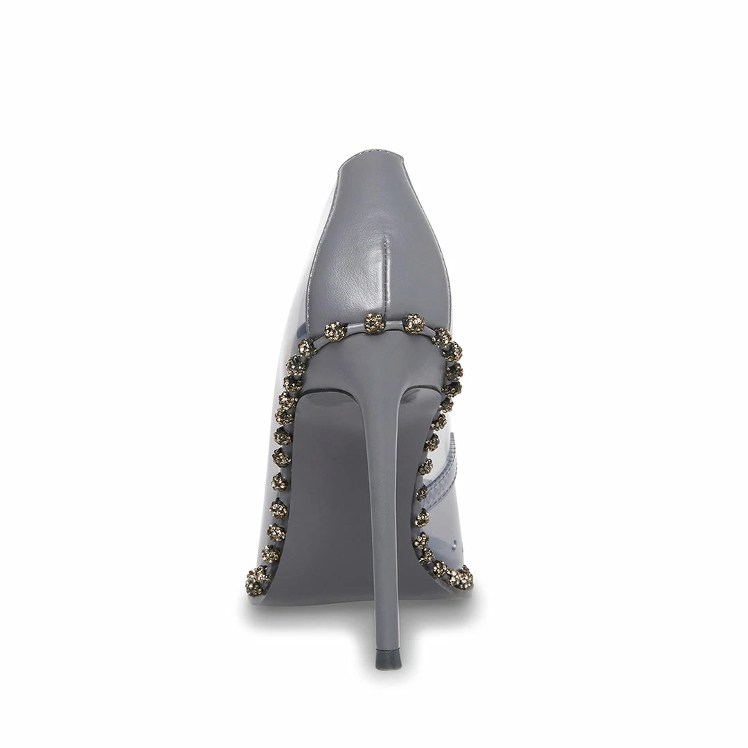 A trendy transparent upper gives this pump modern direction, while foot-framing rhinestones bring the glam factor. Step in and sparkle as you strut!