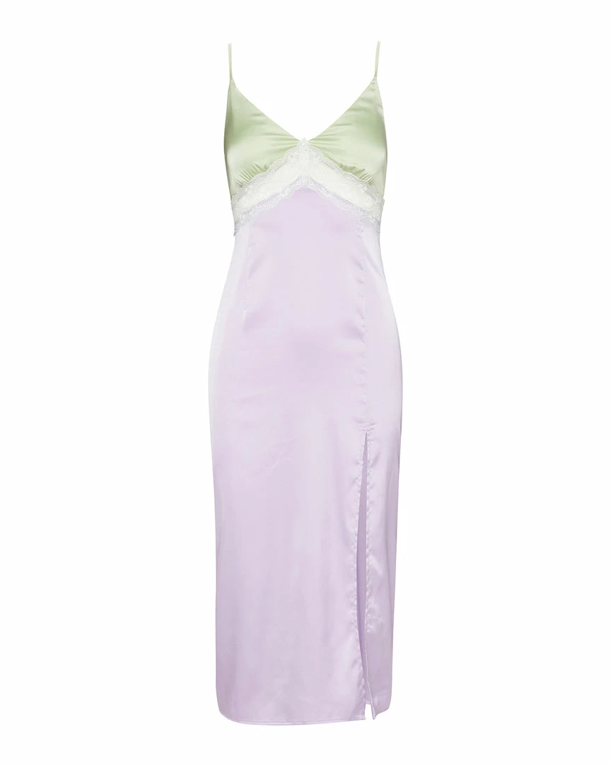 Classic lingerie vibes, but made for going out with your friends. The Satin Lace Midi Dress is inspired by vintage underpinnings, featuring barely there spaghetti straps, lace at the bust, and a thigh-high slit.