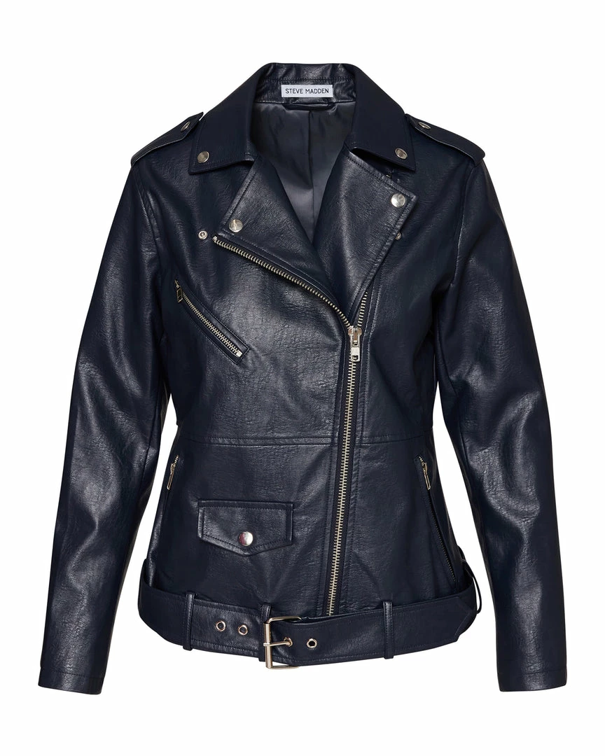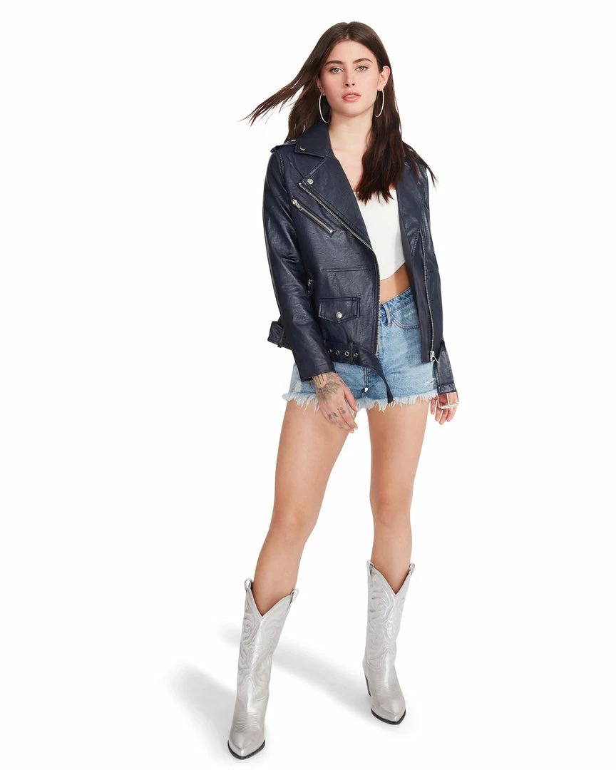 Give some serious attitude in our vegan leather jacket. This moto jacket is a classic staple, perfect for wearing with any fit.