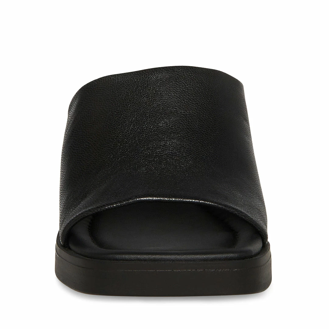The KATE slide sandal pairs a wide leather upper strap with a square toe and a block heel.