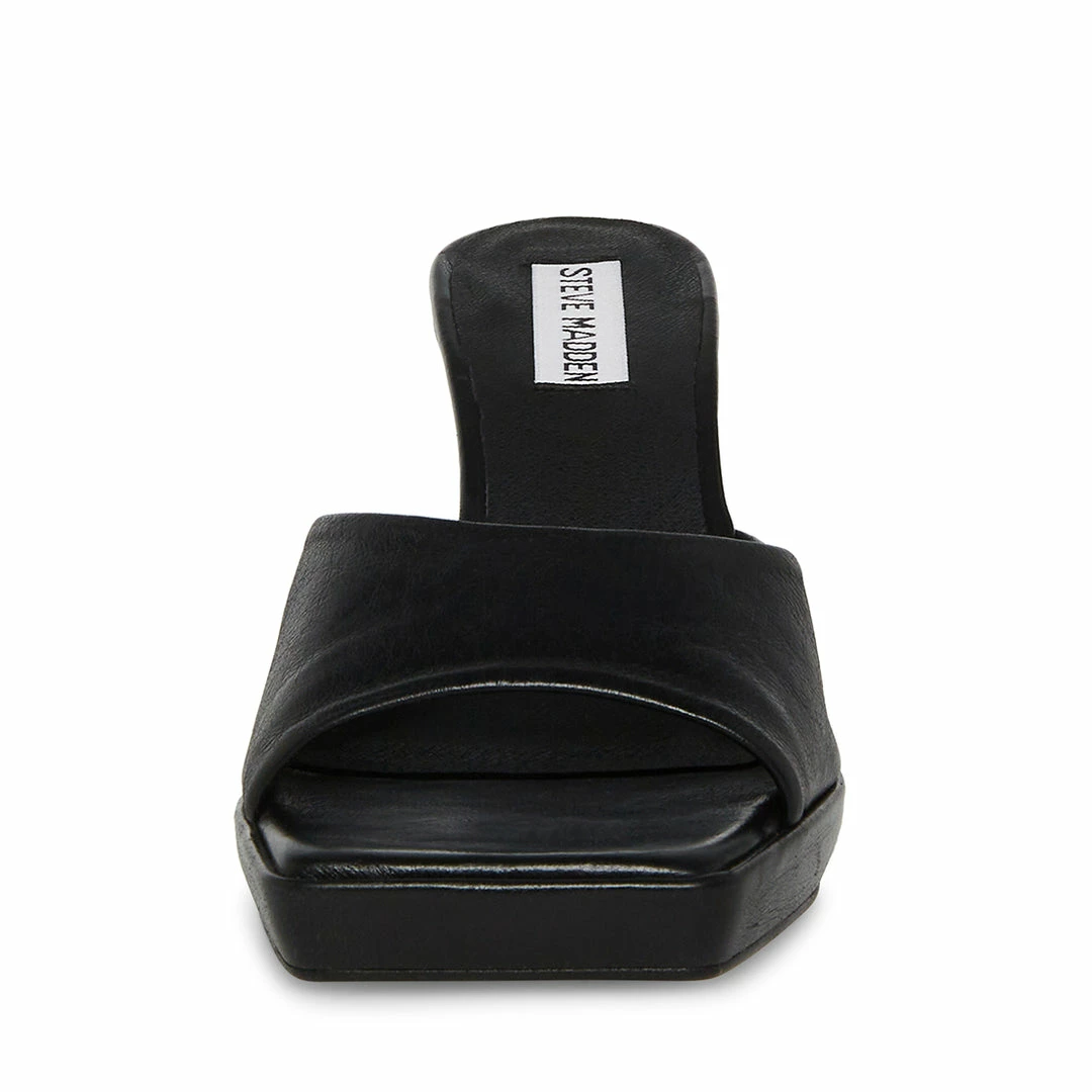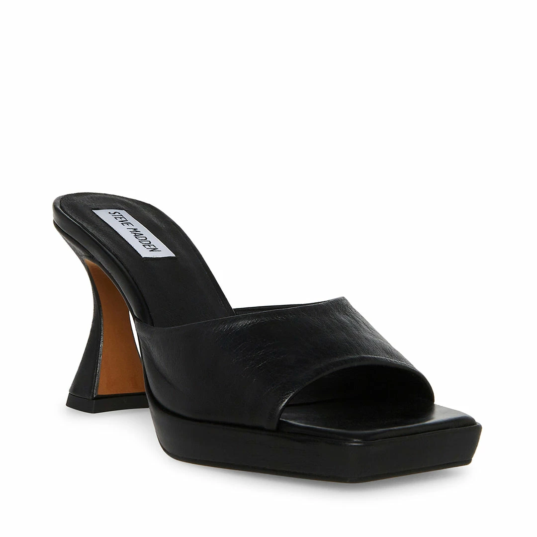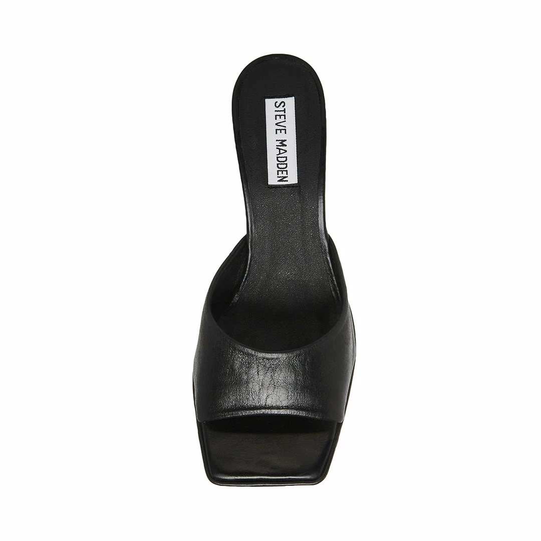 PENNY is a leather slide sandal with a single front strap perched atop a concave curved heel and a square toe.