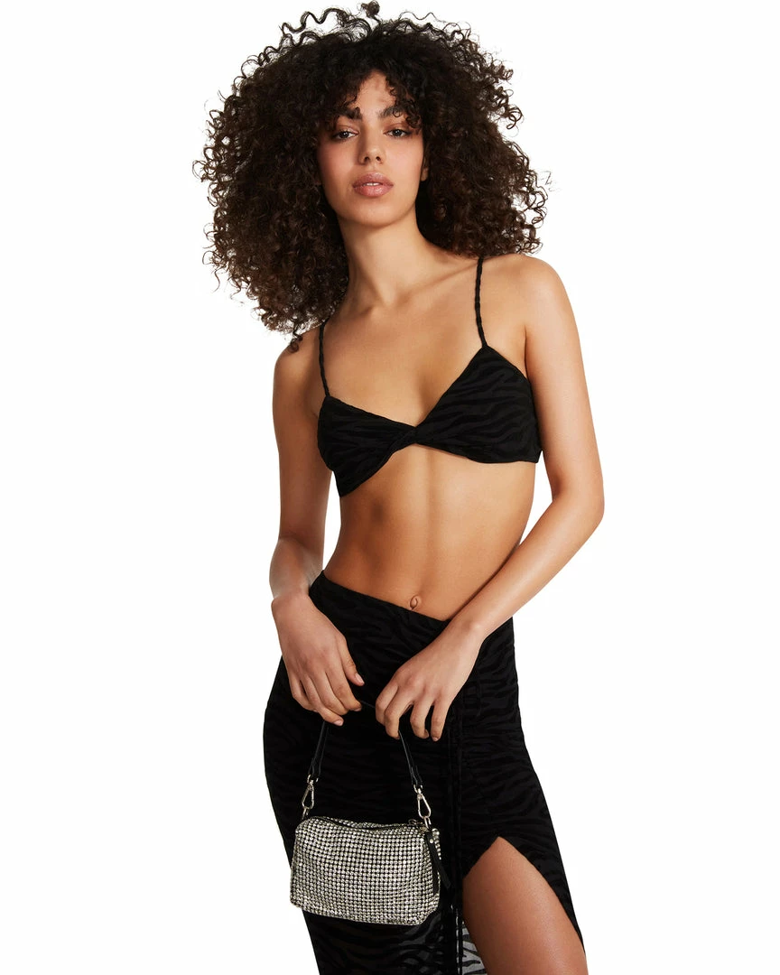 Rawr. The Zebra Bralette was made for her partner-in-crime, the Zebra Ruched Mini Skirt.. It has an easy pull-on silhouette and zebra burnout fabric.